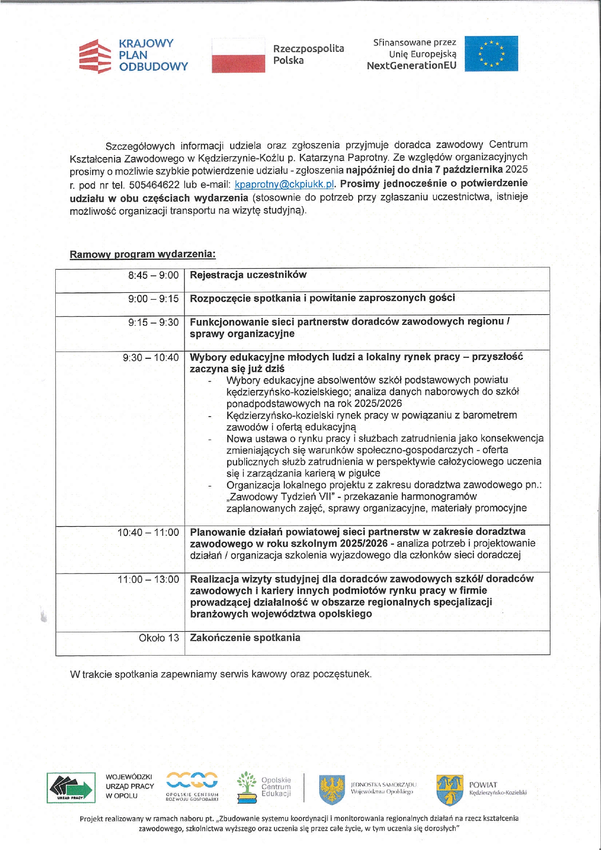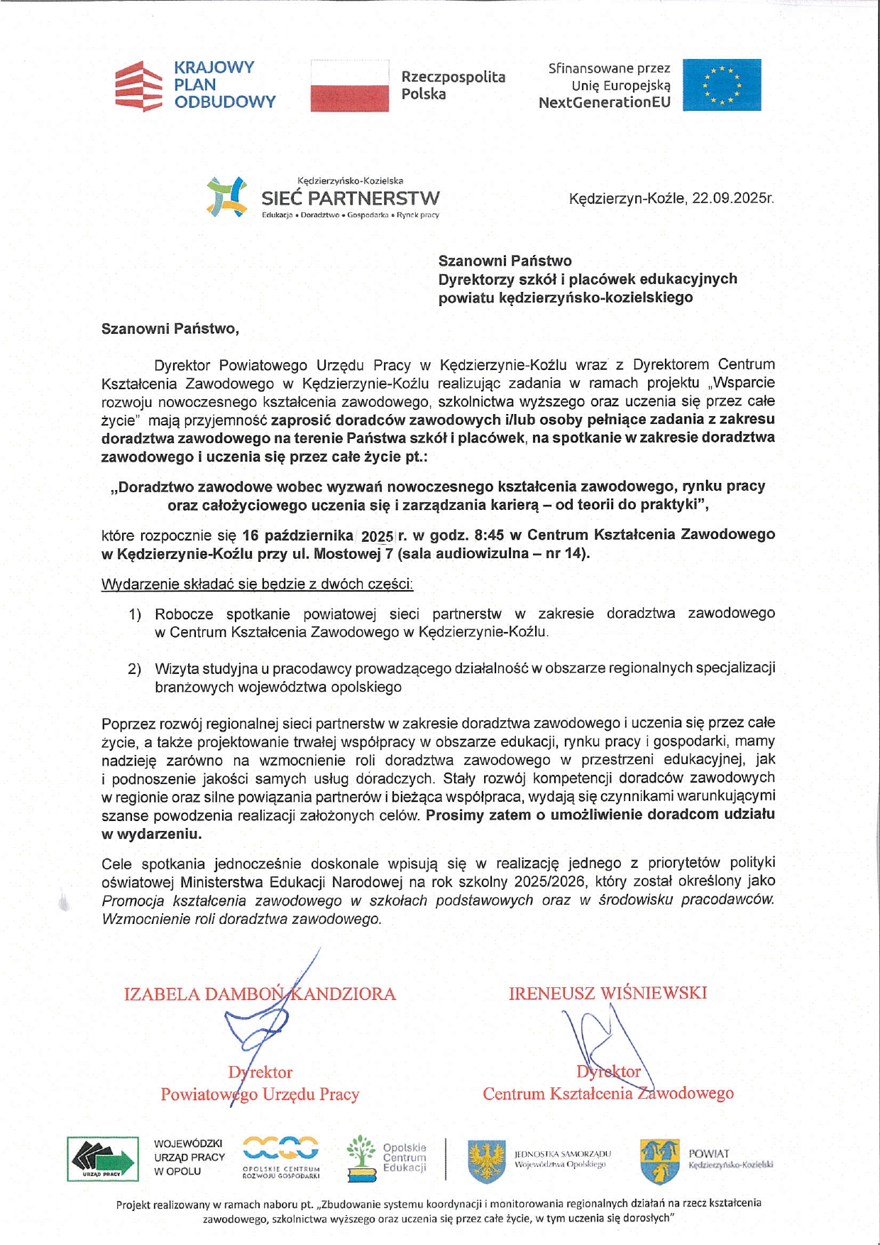 rozpocznie się 16 października 2025 r. w godz. 8:45 w Centrum Kształcenia Zawodowego w Kędzierzynie-Koźlu przy ul. Mostowej 7 (sala audiowizulna – nr 14). Serdecznie zapraszamy do rejetsracji i udziału w spotkaniu.