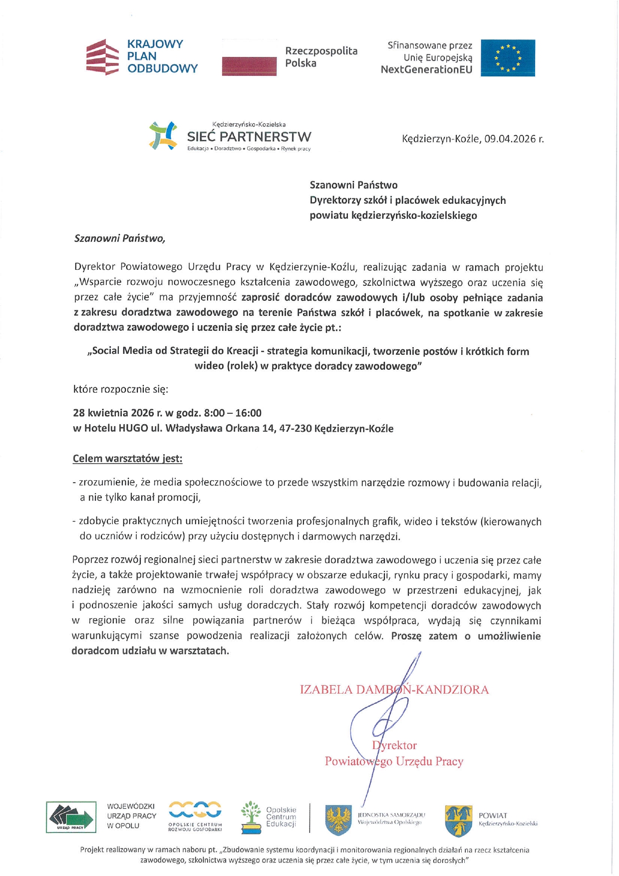 rozpocznie się 28 kwietnia 2026 r. w godz. 8:00 w Hotelu HUGO (ul. Orkana 14) w Kędzierzynie-Koźlu. Serdecznie zapraszamy do rejestracji i udziału w spotkaniu doradców zawodowych i osoby realizujące zadania z zakresu doradztwa w szkołach i placówkach regionu.