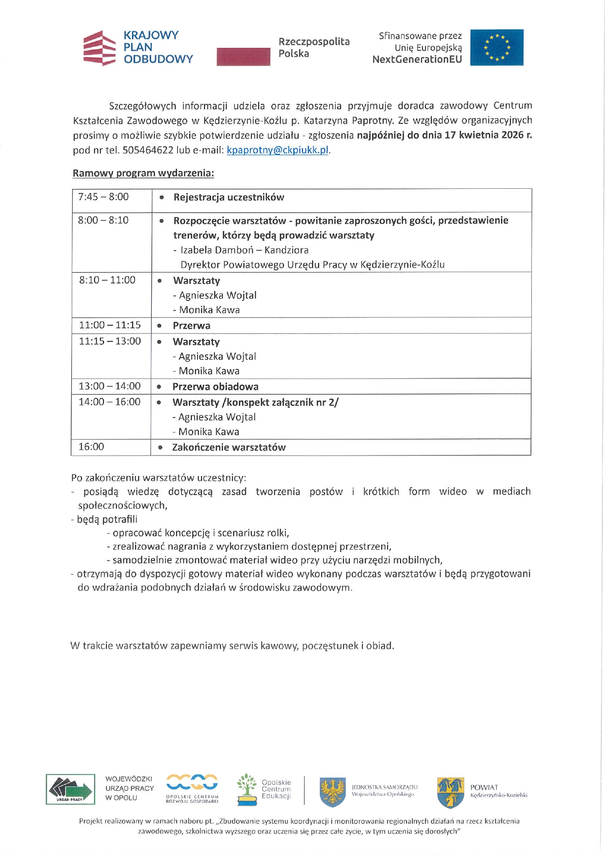 W załączeniu programy wydarzenia na 11 i 12 marca 2025 r. Osobą do kontaktu udzielającą wszelkich informacji i wyjaśnień jest p. Katarzyna Paprotny – doradca zawodowy Centrum Kształcenia Zawodowego w Kędzierzynie-Koźlu.