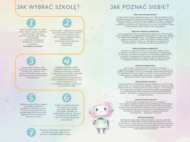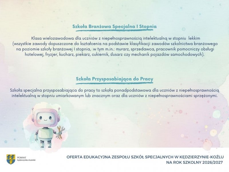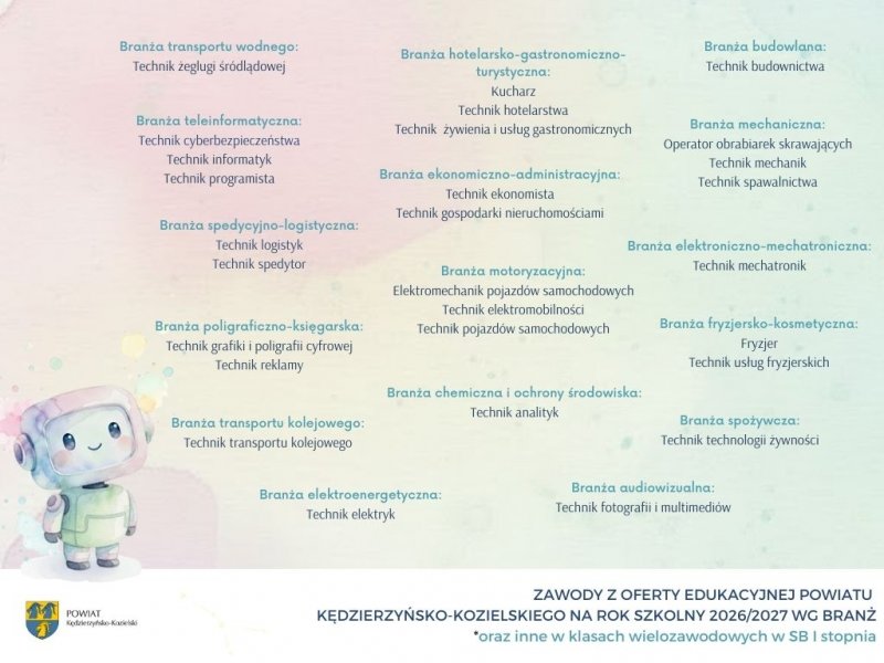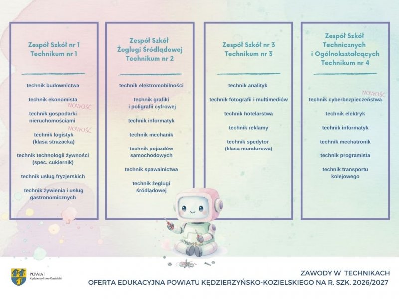 Po raz kolejny CKZ przygotowało ściągę z pełną ofertą edukacyjną powiatowych szkół ponadpodstawowych. Pełen wykaz szkół, profili i zawodów do których prowadzona będzie rekrutacja na rok szkolny 2026/2027 znajdziecie już w zakładce informator. Publikacja ułatwia szybkie poznanie możliwości dalszej edukacji w powiecie, a także zawiera najważniejsze informacje dotyczące samego procesu naborowego. Zaczęcamy do korzystania.